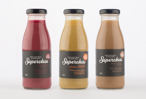 Branding and packaging design for The Chai Room and its new range of drinks - Superchai! The Chai Room wanted to appear established, yet have a unique and fun edge. The use of black, plus one key colour, alongside a strong brandmark were developed to portray this.